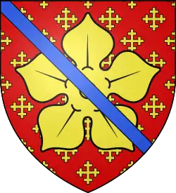 Gules, crusily and a cinquefoyle or, a bendlet azure".