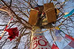 In 2009, Robin Wood ended its membership of FSC International in protest and limited itself to cooperation and membership of the FSC working group in Germany.[16] The association also ran a campaign against disposable cups under the slogan 'Avengers of the cups – forest protection instead of disposable cups'. Protests against coal-fired power generation were also an issue that was accompanied by campaigns.[17] Other issues include uranium transports through Germany and fracking.[18][19]
