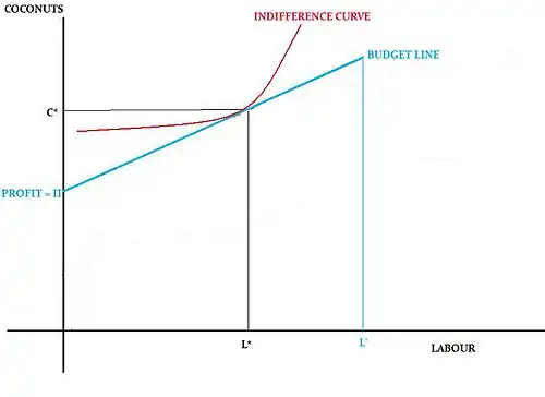 Note that labour is assumed to be a 'bad', i.e., a commodity that a consumer doesn't like. Its presence in his consumption basket lowers the utility he derives.[1] On the other hand, coconuts are goods. This is why the indifference curves are positively sloped. The maximum amount of labour is indicated by L'. The distance from L' to the chosen supply of labour (L*) gives Crusoe's demand for leisure.