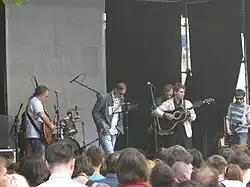 In the late 1980s and early 1990s a new generation of Ukrainian rock artists emerged, represented among others by Opalnyi Prynz, perhaps the most influential rock band of that period, followed by its predecessor Loony Pelen.[11] An important event in the history of Ukrainian music during the last years of Soviet rule was the Vyvykh festival, whose first edition took place in Lviv in 1990. Among performers who played at the event were rock bands Mertvyi Piven, Plach Yeremiyi, Tabula Rasa (Ukrainian band), Banita Bayda, as well as future members of Skryabin. During that period music festivals became a vivid expression of protest against the Soviet regime and played an important role in the Ukrainian independence movement.[12]