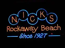 Hugging the coast at the center of Rockaway Beach is a cluster of restaurants and shops, the oldest of which is a Pacifica landmark, Nick's Seafood Restaurant. Another restaurant, historically the romantic Moonraker, hosts nighttime views over the illuminated waves of the Pacific crashing at the restaurant foundation bulwarks. Newer shops nestle behind the Moonraker, many a product of the city's 1986 redevelopment plan.