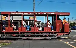 A passenger tramway began operating on 16 June 1909, making Rockhampton the only provincial city in Queensland to have a street tramway.[34] Purrey steam trams ran on a number of routes throughout South Rockhampton, totalling 10 kilometres (6.2 mi) of track. The discomfort of passengers riding in steam trams in a tropical climate in part led to their demise in 1939, replaced by a bus network run by the City Council.[35]