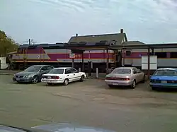 However, design completion was delayed to January 2014 due to the need to place a substation inside, rather than guarded by a fence, and then to October 2014 by other matters.[15][16] Although the project did not include an engine shed, new platform, or parking lot improvements, it was specifically designed not to preclude them and the MBTA can add those elements later if funding becomes available.[16] Construction of the $5 million project took place in 2017 and 2018. Along with the electrical upgrade, it included paving of the parking lot and access road, installation of a tactile strip on the platform edge, and CATA signage.[17][18]