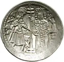 Roger (left), in battle dress and bearing a sword, and his father (right), dressed as a Byzantine emperor. From the first issue of the ducat (1140). | |