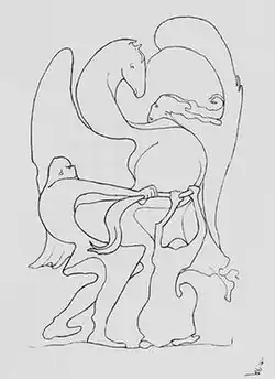 From the 1930s onward, her work was largely forgotten.[51] In 1930, while laid up with a sprained leg, Brooks began a series of more than 100 drawings of humans, angels, demons, animals, and monsters, all formed out of continuous curved lines. She said that when she started a line she did not know where it would go, and that the drawings "evolve [d] from the subconscious...[w]ithout premeditation."[52] Brooks was writing her unpublished memoir No Pleasant Memories at the same time she began this series of drawings. Critics have interpreted them as exploring the continuing effect of her childhood on her—a theme expressed even in the symbol she used to sign them, a wing on a spring.[53] Decades later, at 85, she said, "My dead mother gets between me and life."[54]