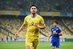 Yaremchuk was included in the Ukrainian senior squad for Euro 2020.[37] In its first group stage match, he assisted the first and scored the second goal in a 3–2 loss against the Netherlands at Johan Cruyff Arena in Amsterdam,[38] and scored in a 2–1 victory against North Macedonia at Arena Națională in Bucharest.[39]