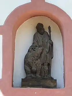Upon Romedius' death, his disciples carved his burial place into the rock by the grotto where he had lived, a site that was soon visited by pilgrims.[5] The Sanctuary of San Romedio grew from the little church that was built to venerate him to a popular pilgrimage shrine. The Santuario di San Romedio is across the lake from Cles at the head of the Val di Non, above the village of Sanzeno. The sanctuary where Romedio lived with his bear companion is a complex of several churches, from the Romanesque period to the 20th century beyond a gateway in the forested slopes. Votive offerings of crutches line the walls of the narrow stone stairwell up to the highest chapel, said to mark the site of the saint's retreat.