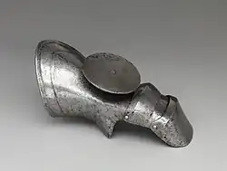 Armets often carried a small rondel, also called a volet, attached to the nape of the helmet's skull by a stem.[7] This disk is believed to have protected the leather strap of the wrapper (a reinforce for the visor that preceded the buffe) and prevented an opponent from cutting it away, along with protecting the rear junction of the cheekpieces.[8] Early close helmets, which often mimicked the style of the armet, also made use of rondels at the nape and occasionally at higher points of the skull of the helmet.[9]
