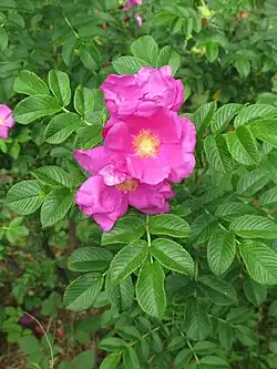 Rosa rugosa (rugosa rose, beach rose, Japanese rose, Ramanas rose, or letchberry) is a species of rose native to eastern Asia, in northeastern China, Japan, Korea and southeastern Siberia, where it grows on beach coasts, often on sand dunes.[1] It is naturalized in much of Europe and parts of the United States and Canada.[2] It should not be confused with Rosa multiflora, which is also known as "Japanese rose". The Latin word "rugosa" means "wrinkled", referring to the wrinkled leaves.[3][4] Often used as an ornamental plant, it has become invasive in parts of Europe, North America and South America.[5][6]