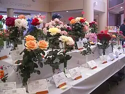 The American Rose Society sets guidelines and standards for rose shows in the US (and for Canadian rose societies affiliated with the ARS) and is the International Cultivar Registration Authority for Roses by appointment of the International Society for Horticultural Science.[9][4] The Rose Society UK sets the guidelines and standards and organises rose shows in the UK. Many Canadian and Australian rose societies were affiliated with the RNRS in addition to their own national societies. Rose shows using ARS guidelines use cultivar classifications assigned by the ARS, for instance Hybrid Tea or Gallica.[10] The ARS also assigns one of 18 official color classes to cultivars, for instance Light Yellow, Medium Yellow, Deep Yellow, and Yellow Blend. There is no color class for blue. Rose shows are hosted by local societies and may be organized as a local show, an ARS District show, or an ARS National show. Local shows generally require no registration or entry fees, while District and National shows do. All three levels of rose show generally offer three divisions: Challenge Classes, Horticulture, and Arrangements. Other divisions may be offered, for instance Rose Photography or Rose Crafts. Rose-themed Quilts have been included at rose shows. The Challenge Classes available vary between the local, District, and National levels.