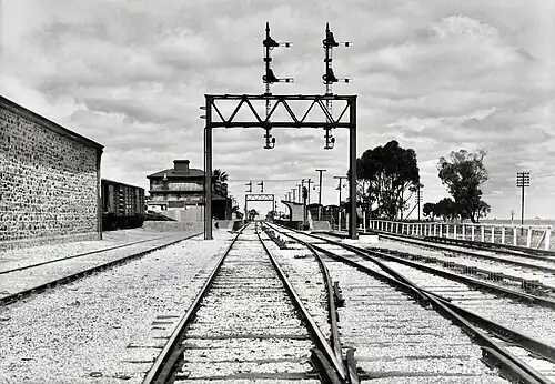 Roseworthy railway station opened on 13 August 1860 as part of the extension of what was then known as the Northern Railway to Kapunda.[1] The station was built on land within the Hundred of Mudla Wirra that was purchased by landowners William and Grace Gartrell.[2] The station facilities included a two-storey stone station building and a stone goods shed.[3] The design of the original station building was similar to the buildings that once existed at Dry Creek and Salisbury. The station became a junction station on 3 July 1869, with the opening of the railway line to Forresters (Now Tarlee.)[4] The railway to Kapunda reached Morgan on 23 September 1878, providing a connection to the Murray River.[5] The railway to Tarlee reached the Crystal Brook-Broken Hill railway line at Petersburg (now Peterborough) on 11 May 1881. The passenger platforms were extended in 1913 to allow for longer trains to stop at the station.[6] In approximately the 1950s-1960s, the original 1860 two-storey station building was replaced with a single-storey building. In 1960, grain silos were provided at the station yard, allowing goods trains to load wheat from the area for export.[7]