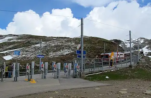 Rotenboden is a railway station on the Gornergrat railway, a rack railway which links the resort of Zermatt with the summit of the Gornergrat. The station is situated west of the Gornergrat, in the Swiss municipality of Zermatt and canton of Valais. At an altitude of 2,815 m (9,236 ft) above mean sea level, it is the second highest open-air railway station in Europe, after the Gornergrat railway station, on the same line.[1][2]