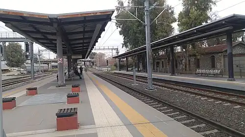 Rouf railway station (Greek: Σιδηροδρομικός Σταθμός Ρουφ, romanizedSidirodromikos stathmos Rouf) is a station on the Piraeus–Platy railway line in Rouf, a neighbourhood of Athens, located on the borders of the municipalities of Athens and Tavros. Originally opened on 30 June 1884 it was rebuilt to serve Athens Suburban Railway lines when this section came into operation in June 2007.[4] It owes its name to the area of Rouf, named after a Bavarian businessman who once owned the land in the 19th century.