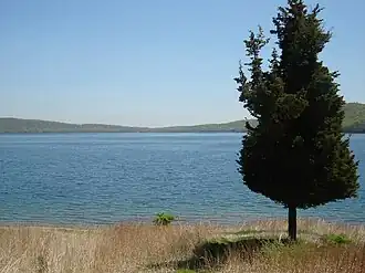 The Round Valley Reservoir in Clinton Township in Hunterdon County, New Jersey, United States, was formed in 1960 when the New Jersey Water Authority constructed two large dams and flooded a large valley. The reservoir is named after the naturally formed circular valley surrounded by Cushetunk Mountain. The deep valley was caused by erosion of the soft sedimentary rock. The surrounding ridges of Cushetunk Mountain endure because they were underlaid with dense and durable volcanic rock diabase that cooled slowly under the surface of the Earth. The reservoir covers what used to be a farming community, with remains of a school and a church on the lake floor among other buildings.[1][2]