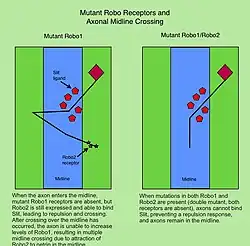 A large-scale screen of the Drosophila genome for mutants that exhibited axon guidance defects led to the discovery of the roundabout (robo) mutation.[9] In robo mutants, axons were observed to inappropriately cross and recross the midline. It was subsequently found that the secreted protein Slit was the ligand for the Roundabout receptor.[10] Vertebrate Slit proteins were identified shortly after, and were shown to bind both vertebrate and Drosophila Robo receptors and to mediate axonal repulsion of spinal cord explants.[4] It was several more years before a functional analysis of the vertebrate Slit and Robo mutants was performed; this analysis demonstrated that Slit-Robo signaling regulates commissural axon guidance in vertebrates as well.[11] While the vertebrate receptors Robo1 and Robo2 signal repulsion in response to Slit to prevent inappropriate midline crossing, a novel function for Robo3/Rig1 was discovered; unlike the other Robo receptors, it is required to promote midline crossing.[12]