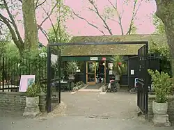 The main gates were built in 1895 by "Messrs. Tickner and Partington" at the Vulcan Works, located on Harrow Road, Kensal Rise.[3][4][6] The wrought iron fence is 270 feet long and a maximum of 18 feet tall at certain places. Originally there was the Willesden Local Board's coat of arms on the gates, but along with general acanthus leaf decorations, it has gradually disappeared over the years.[3][4][6]
