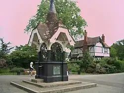 The drinking fountain, with the plaque commemorating the opening of the park. The lodge house is in the background.