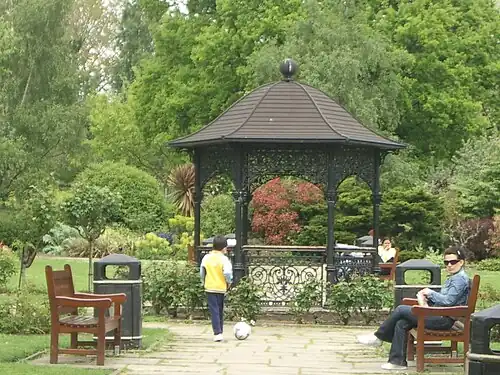 To mark the 100th anniversary of the park in 1995, the paved rosebush-lined central pathway was equipped with sturdy new seats and a Victorian-style gazebo.[3][4][6]