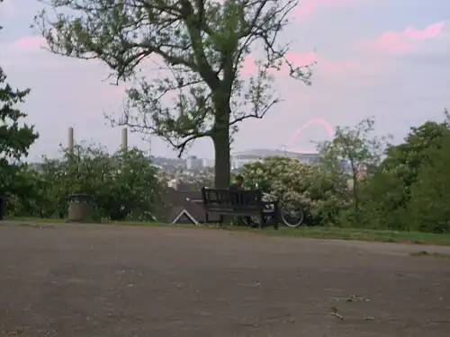 For more than 10 years after the Park opened, the Willesden Junction Brass Band gave concerts at the bandstand. This became so popular, that a new rustic-type bandstand was built to the south of the "Gymnasium", where more space for the audience was available. The hilltop became the viewing point.[3][4][6] Once Wembley Stadium was erected, it could be seen from the viewing point.