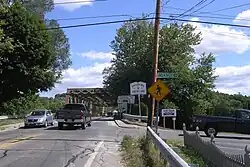 Route 113 crosses the Merrimack River on the Tyngsboro Bridge. The bridge on the right was a temporary crossing while the 1930s bridge was being rebuilt.