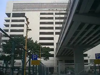 An overhead viaduct carries Route 5 through a parking garage in Yau Ma Tei
