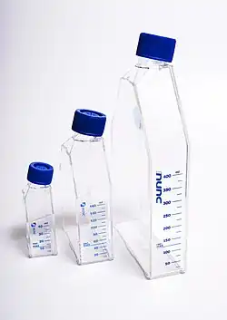 A Roux culture bottle, or simply Roux bottle, is a type of laboratory glassware used in biology and related sciences to grow microorganisms or tissue cells.[1]: 5 [2]: 1886  It consists of a bottle of transparent glass[3] or plastic[4] with two closely spaced flat, rectangular, parallel faces and a short neck; of such a design that the bottle can be laid down sideways, on one of those two faces, even when unstoppered and partially filled with a culture medium. This goal is achieved by having the neck narrowed,[3] offset,[5] partially blocked,[6][7] or canted (tilted).[8][9] The item is also generically called cell culture bottle[4] or tissue culture (TC) bottle,[8] and flask may be used instead of "bottle".[3]