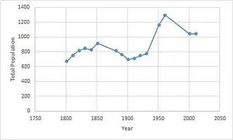 Overall, Roxwell's population has grown over the last 200 years. From 1800, population was gradually increasing. For 50 years it increased with few fluctuations, but then started to decrease. Eventually population was back at the same level as it was in 1800 of around 650 people in this area. However, after this point, population slowly started to increase and then following the end of the Second World War in 1946 there was a baby boom. This meant that population reached its peak around 1960 at just over 1200 people, but then declined rapidly. However, looking at the data from all previous census' dating back to 1800, and specifically at the 2011 census, it is continuing to grow at a steady rate to just over 1000 people.