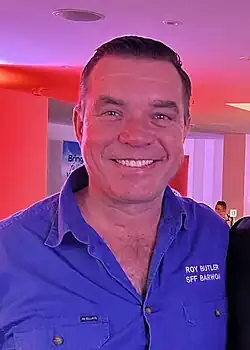Royal Francis Butler (born 22 March 1977)[2] is an Australian politician who has been a member of the New South Wales Legislative Assembly since March 2019, representing the electoral district of Barwon as an independent.[3] He is a former member of the Shooters, Fishers and Farmers Party.[4][5] Butler first won the seat in 2019, taking it from the Nationals for the first time in almost sixty years. He was returned for a second term at the 2023 state election.