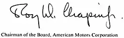 Roy Dikeman Chapin Jr. (September 21, 1915 – August 5, 2001) was the chairman and chief executive officer of American Motors Corporation (AMC). Chapin's father, Roy D. Chapin Sr., was one of the co-founders of the Hudson Motor Car Company; Hudson later merged with Nash-Kelvinator Corporation in 1954 to form American Motors. Roy D. Chapin Jr. was instrumental in introducing many successful lines of cars by American Motors that included the Gremlin, Hornet, and Javelin, as well as the purchase of Kaiser Jeep by the automaker.[2][3]