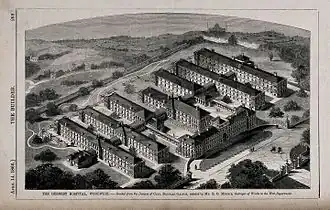The hospital was built on the authority of Sidney Herbert, responsible for sending Florence Nightingale to the Crimea, leader of War Office reforms after this campaign, and passionate about health care and reducing military mortality rates from diseases and ill-treated war wounds. Designed by chief architect Sir Douglas Galton (of the Royal Engineers), the hospital is notable for the design inputs of Nightingale (Galton's aunt and his cousin by marriage).[1] It opened on 1 November 1865[2] and in the following year Jane Catherine Shaw Stewart, Nightingale's colleague, became responsible for the nurses until she was obliged to stand down after accusations of bullying.[3]