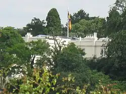 Following the renovations, Prince Andrew with his two daughters moved into the house in 2004, having vacated Sunninghill Park.[7] In 2008, his former wife Sarah, Duchess of York moved into Royal Lodge, again sharing a house with the Duke of York.[8] It has been reported that the open market value of the property would have been at least £30 million, as of January 2022.[9] After the Duke of York stepped down from public duties in November 2019, the flagpole on the roof of Royal Lodge, used to fly the personal Royal Standard of the Duke of York when in residence, was removed.[9] In 2023, reports suggested that King Charles III was to cut Andrew's annual grant, potentially leaving him unable to afford the Lodge's running costs, and he had been offered the smaller five-bedroom Frogmore Cottage instead, until then the UK residence of Prince Harry, Duke of Sussex and his family, who had been issued a request to vacate by Buckingham Palace.[10]