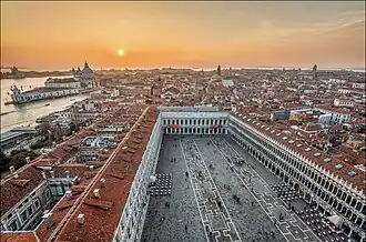 A view from above of the St Mark's Square with the Royal Palace on the left