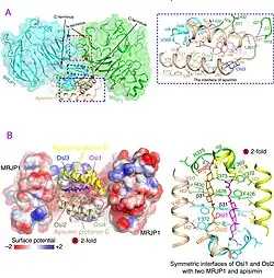 A. Detailed interactions of MRJP1 and apisimin in the MRJP1 dimer; symmetric intermolecular C-terminal and N-terminal interactions and intermolecular C-terminal antiparallel β-sheets β31 (left). B. Interactions of Osl in the MRJP1 oligomer; four Osl (ostreasterol or methylenecholesterol) molecules in the surface potential of MRJP1; interactions of the inner two Osl molecules with MRJP1 and apisimin (left).