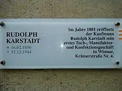 With a loan of 1000 thaler from his father and with the help of his two sisters, Karstadt opened his first store, ″Tuch-, Manufaktur- und Konfektionsgeschäft" at the Krämerstr. 4 in Wismar on 14 May 1881.[2]