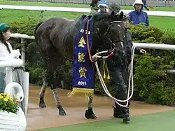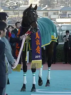 In the Japan Cup on November 25, despite a slow start and a blistering final 600m (32.7 seconds), he finished 3rd behind Gentildonna and Orfevre.[27] His final start, the Arima Kinen on December 23, was marred by a 10-length delay at the gate after he stood up in the gate. Rallying from last, he managed to catch up with the pack, finishing 3rd behind Gold Ship and Ocean Blue. This was his third consecutive third-place finish.[28][29]