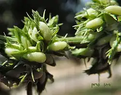 Rumex dentatus is a species of flowering plant in the knotweed family known by the common names toothed dock[1] and Aegean dock. It is native to parts of Eurasia and North Africa, and it is widely known elsewhere as an introduced species. It grows in disturbed habitat, often in moist areas, such as lakeshores and the edges of cultivated fields. It is an annual or biennial herb producing a slender, erect stem up to 70 or 80 centimeters in maximum height. The leaves are lance-shaped to oval with slightly wavy edges, growing to a maximum length around 12 centimeters. The inflorescence is an interrupted series of clusters of flowers, with 10 to 20 flowers per cluster and each flower hanging on a pedicel. Each flower has usually six tepals, the 3 inner of which are edged with spinelike teeth and have tubercles at their centers.
