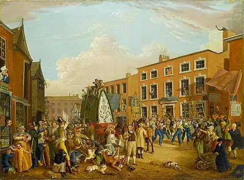 In the 18th century the ceremony usually formed part of the annual feast or wake, held on the Sunday closest to the feast day of the saint to which the church was dedicated.[9] The rushes were brought to the church in a procession, accompanied by music and Morris dancing. In some areas the rushes were carried in individual bundles and in others on a rushcart. Where a rushcart was used it became the main focus and was decorated with garlands and flowers,[10] tinsel, and 'all the silver plate that can be borrowed in the neighbourhood'.[11] When the procession reached the parish church the rushes were strewn on the floor and the garlands used to adorn the church.[12][13] It is not known how long rushcarts have been a feature of the festivities, but an account by the Hon. H. Egerton from 1726 implies that the one he saw in use in Prestwich was of long standing.[14]