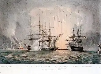 Gangut (Hanhoute) and Azoff, with explosion of a Turkish frigate, at the Battle of Navarino, 20 Oct 1827