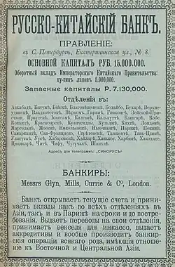 The bank immediately opened a branch in Shanghai in February 1896.[8] On 28 August 1896 it partnered with the Chinese imperial government for the construction of the Chinese Eastern Railway, acting as a conduit for project financing from the Russian government, and also receiving capital financing from the Chinese authorities - the only time ever that the Qing empire was involved in the capital of a foreign enterprise.[2] In Chinese, the bank was then referred to as "Sino-Russian Righteousness Victory Bank" (Traditional Chinese: 華俄道勝銀行).[9][8] By 1902, it had become the second-largest bank in China,[8] and the fifth-largest private-sector bank in the Russian Empire.[10]: 43 In 1898, the State Bank of the Russian Empire took a significant share of the bank's newly issued capital.[2] The Russian interests subsequently prevailed in the bank's management, and its French stakeholders were marginalized. The Russo-Chinese Bank's activity had initially been focused north of the Yangtze in order not to compete further south with the French-sponsored Banque de l'Indochine, but the bank breached that arrangement by opening a Hong Kong office in 1904.[6]