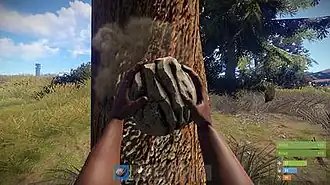 As a multiplayer-only video game,[1] Rust pits players against each other in a harsh, open world environment with the sole goal of survival. Animals, such as wolves, bears and big cats, act as a looming threat, but the primary danger comes from other players.[1] Most maps are procedurally generated,[2] with the exception of some pre-built maps.[3] When beginning, a player only has a rock and a torch. The rock can cut down trees, break apart stones, and be used as a weapon. Cloth and food can be gathered by killing animals; mining provides stone, metal ore, and sulfur ore; and chopping down trees provides wood.[4] To survive in the world, the player must gather resources and use them to craft tools, weapons, and other gear.[5][6] To craft items, the player must have a sufficient amount of all required materials,[7] with advanced items needing more obscure components found in monuments which are automatically generated structures sometimes guarded by violent NPCs around the map.[8] There are limitations imposed on the amount of craftable items, with blueprints allowing the creation of more advanced items.[7] The game features 4 distinct biome regions per map being a jungle, plains, a desert and a snowy tundra, each posing their own challenges and benefits.