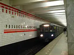 Ryazanskiy Prospekt (Russian: Рязанский проспект) is a station on Moscow Metro's Tagansko-Krasnopresnenskaya Line. Opened on 31 December 1966 as part of the Zhdanovsky radius, the station is situated where the line snakes northward and instead of following the Volgogradsky Avenue begins to follow the Ryazansky Avenue which runs several kilometres parallel to it on the north, another avenue and the original road to the city of Ryazan. Like all of the shallow-level stations built at the time, the design is a typical column tri-span, however like Volgogradsky Prospekt the platform has been narrowed. The composition of the station (architects Nina Alyoshina, Yury Vdovin and N. Samoylova) adopted the traditional Ryazan cloth theme to the wall decoration where the white tiles are distinctively articulated at the top with red patterns. Also prominent is the large black level (to keep the proportions) the pillars are faced with grey-indigo marble and the floor is laid with grey and pink granite. Unusually the station has two surface vestibules, each on both sides of the Ryazanskoye Avenue (station is perpendicular to it) as well as access to the Akademika Skryabina street. In March 2002 the station had a modest passenger traffic of 70,410.
