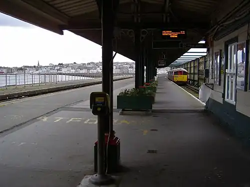 The station originally consisted of three platforms in the form of a pair of islands; a fourth track was added later, opening in 1933.[4] The station was rebuilt on electrification of the remaining line in 1967, and the new layout consisted of two tracks with three platform faces. One of these tracks is now out of use, so only one platform currently operates. This is the track which runs along the western side of the pier; a double track section commences immediately to the south of Ryde Esplanade railway station.