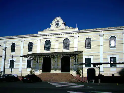 The original building had a façade of exposed bricks, influenced by the English who built the railroad.[8] In 1908, three Italian brothers, Abel, Séttimo, and Bruno Giongo[9] remodeled the building, enlarging the upper floor and elaborating eclectic ornaments. The project was of the Companhia Rio Clarense, together with the Giongo brothers. Besides the station, the complex included old warehouses (to the northwest, in exposed masonry, from 1895)[10] and maintenance workshops (to the south, demolished). To the north, there was also the CIAR Forgery, demolished in the 1960s for the construction of the Quatro de Novembro viaduct. About a dozen other stations were built in the municipality. The São Carlos station operated until 2001 when passenger transport came to an end.[11]