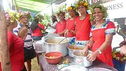 São João is also a celebration of thanksgiving for newly-weds, and for families with babies born during the preceding year. It is thus referred to as Zanvoiamchem fest (transl. son-in-law's feast) locally. The newly married son-in-law is invited for lunch by his mother-in-law, following which the son-in-law is warmly welcomed with the bursting of firecrackers. Family members then sing the litany of all saints in Latin, followed by hymns dedicated to honour Saint John the Baptist, the Virgin Mary and other saints. As part of the celebratory lunch, dishes such as sanna (a steamed rice cake fermented with coconut palm toddy), verdur (pumpkin cooked in coconut milk, along with spices and shrimps) and pork vindaloo are prepared. Dessert includes patollyo (a dumpling stuffed with grated coconut and palm jaggery that is wrapped in fresh turmeric leaves). Following the meal, the family welcomes the village youth, who sing songs dedicated to Saint John and announce their arrival by hitting stumps of coconut palm on the ground. Later, in the evening, the son-in-law returns to his home with an ojem (transl. bamboo basket with gifts) gifted to him by his mother-in-law. This ojem is filled with fruits and sweets. Upon reaching his home, he places the ojem at the oratory of his house, following which everyone recites a short prayer and then distributes the contents of the ojem among his fellow villagers. This is meant to signify that a marriage is not just between two families but between two villages.[5]