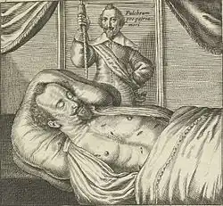 ![]() Corpse of Sébastien de La Ruelle lying in state with wounds exposed. Print published by Jan van Hilten, 1637. | |