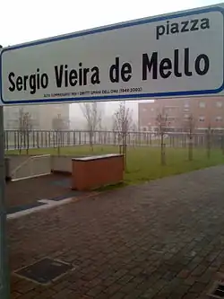 After his death, the Italian city of Bologna was dedicated to Sergio Vieira de Mello a square (Piazza Sérgio Vieira de Mello) situated in a modern part of the central quartiere Navile.
