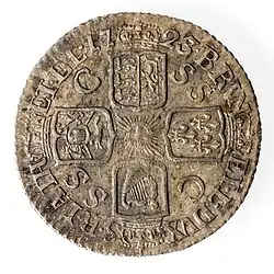 Coinage of the South Sea Company was minted in Britain in 1723, after the South Sea Company (SSC) discovered silver in (and shipped it back from) Indonesia in 1722. The coins minted were Crowns, Half Crowns, Shillings and Sixpences. The Crown is the rarest of them, although the Half-Crown is also difficult to find in higher than VF conditions. The shilling is common, with even mint state examples being easily found. The sixpence is common in most grades, though mint condition ones are rare. All these coins carry "SSC" in the reverse quarters of the cruciform shields.