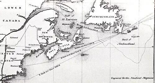 Arctic passed Cape Clear, at the southernmost point of Ireland, early on the morning of September 21, and entered the open Atlantic approaching her maximum speed of 13 knots (15 mph). In settled weather she progressed uneventfully, and early on September 27 had reached the Grand Banks, off the coast of Newfoundland.[26] This area is formed by a series of relatively shallow submarine plateaus forming part of the Canadian continental shelf.[27] Here, the sub-Arctic waters of the Labrador Current meet the warm northbound waters of the Gulf Stream to create weather systems typified by intermittent mists and fog.[28][29] It was the practice for steamers to maintain maximum speeds in these conditions, although before electronic aids to navigation the risk of collision was considerable. Keeping schedules was considered paramount, particularly in the Collins Line where, Alexander Brown states in his 1962 account, "there was no room for overcautious shipmasters".[30] On the morning of September 27, Luce observed typical Grand Banks conditions: "at intervals of a few minutes a very dense fog, followed by being sufficiently clear to see one or two miles."[31]