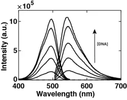 SYBR Gold has two fluorescence excitation maxima when bound to DNA, one centered at ~300 nm and one at ~495 nm, and a single emission maximum at ~537 nm. SYBR Gold exhibits improved DNA cloning efficiency compared to others dyes of the SYBR family because it can be excited with blue light transillumination, which does not cause DNA damage.[4] The fluorescence intensity increases linearly with the number of SYBR Gold molecules bound to DNA up to dye concentrations of ~ 2.5 μM, where quenching and inner filter effects become relevant. For dye concentrations ≤ 2.5 μM the fluorescence intensity as a function of the DNA concentration is well described by a global binding model for dye concentrations.[1]