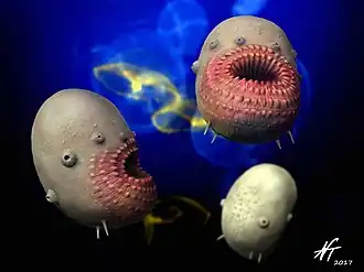 Saccorhytus (from Latin saccus "bag" and Ancient Greek ῥύτις rhytis "wrinkle") is an extinct genus of animal possibly belonging to the superphylum Ecdysozoa,[3] and it is represented by a single species, Saccorhytus coronarius (from Latin attributive coronarius "[of a] crown"). The organism lived approximately 540 million years ago in the beginning of the Cambrian period. Initially proposed as a deuterostome, which would have made it the oldest known species of this superphylum,[4][5] it has since been determined to belong to a protostome group called the ecdysozoans.[6]